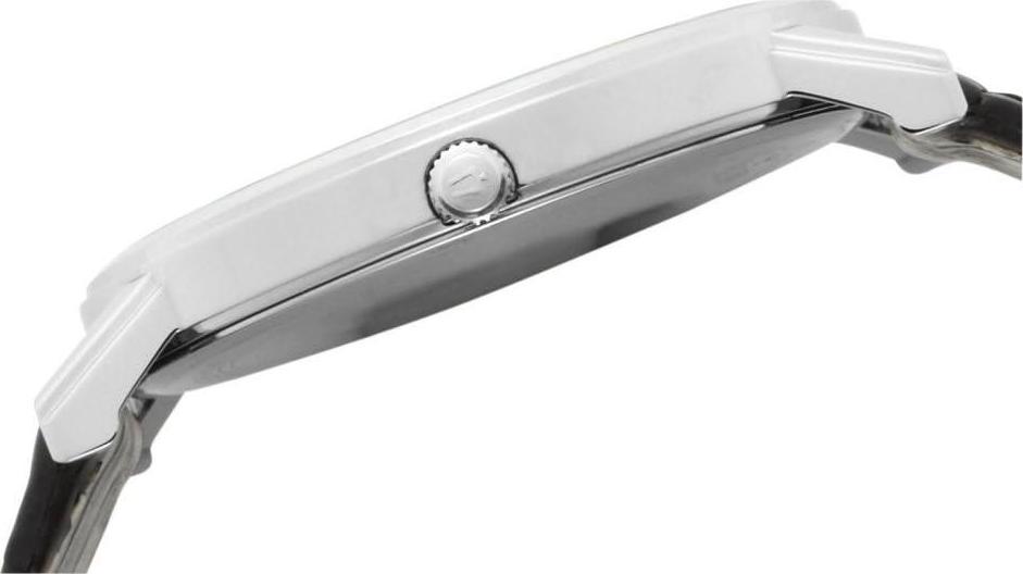 From the Classic Collection. Silver patterned dial. Calendar. Stainless steel case. Black leather strap.