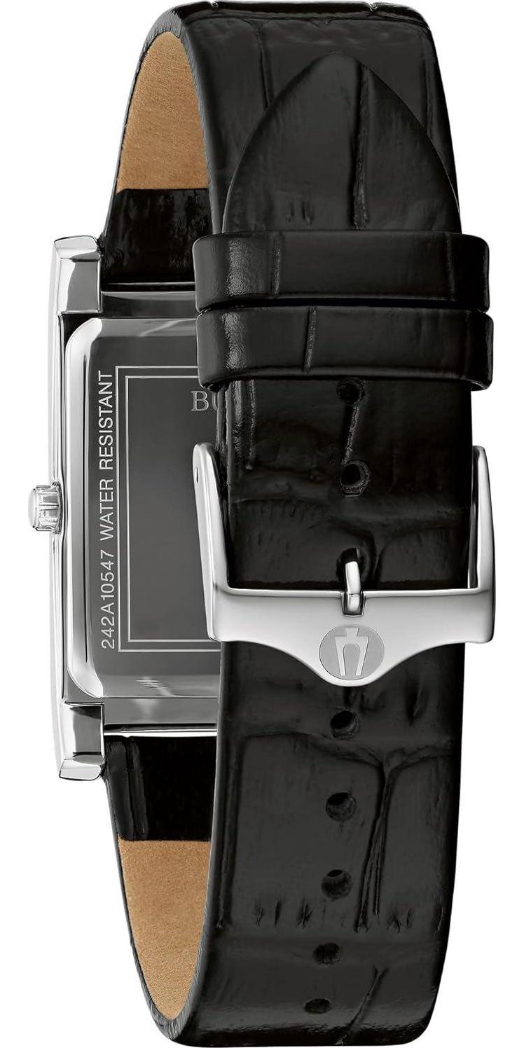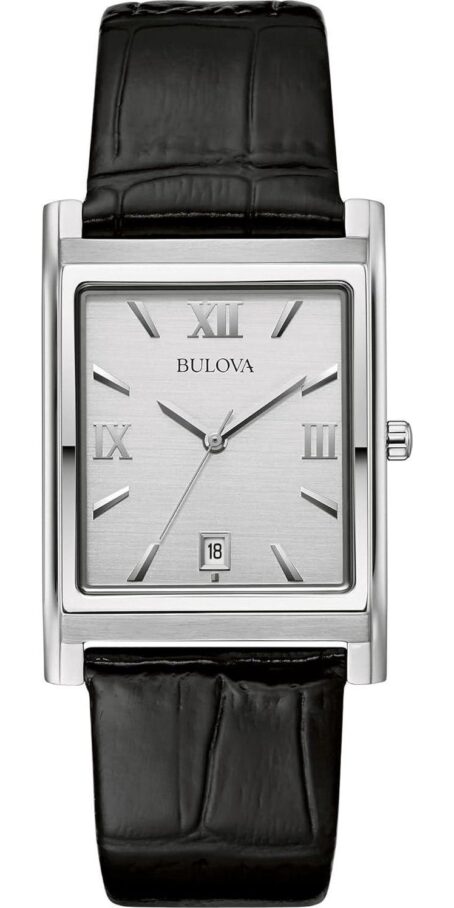 Bulova Men’s Stainless Steel 3-Hand Calendar Date Quartz Watch with Black Leather Strap, Rectangle Dial Style: 96B107