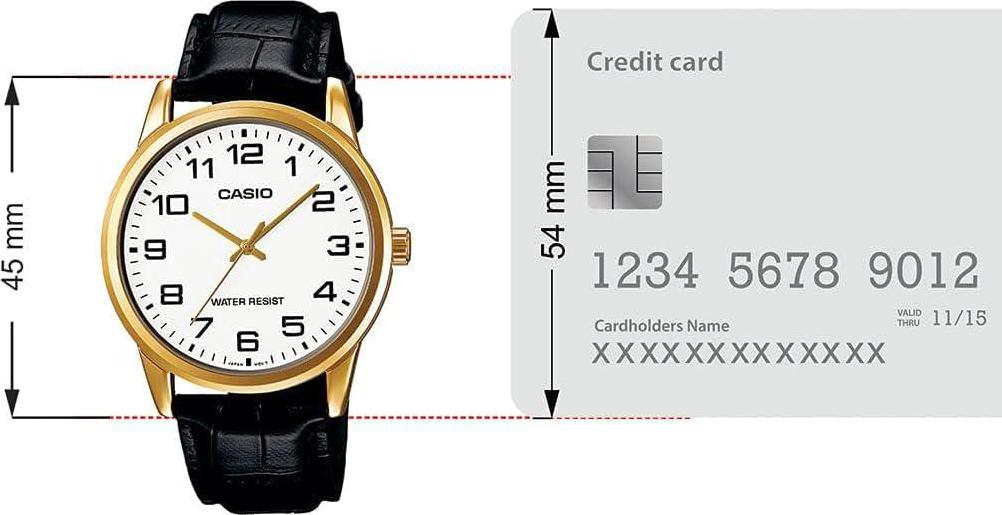 Watch mtp-v001gl-7b brand wrist Casio model of Casio collection collection. 42mm diameter steel case and leather strap Black. Quartz Movement with lacing buckle.