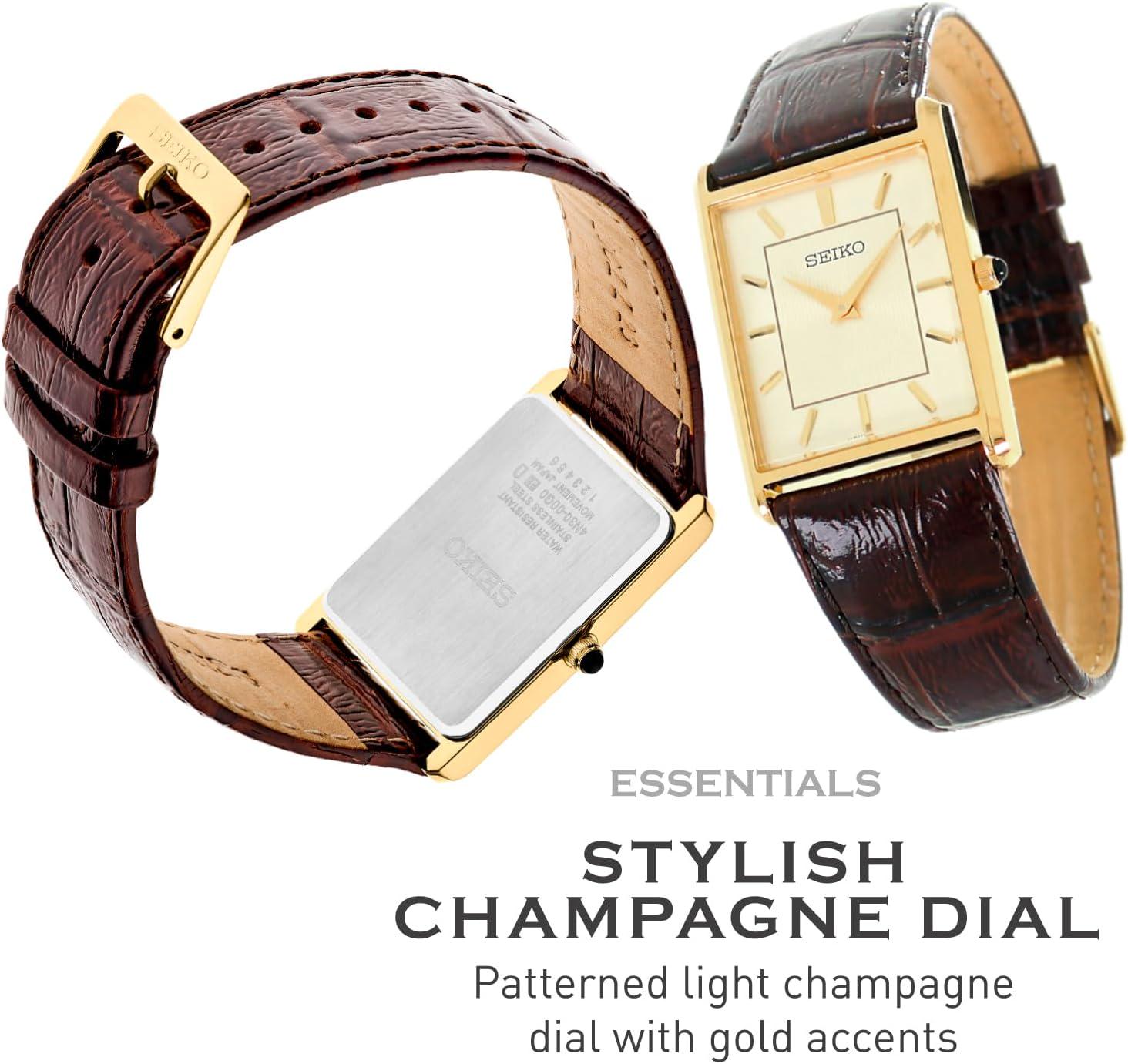 SEIKO Essentials Watch for Men – Essentials – Water Resistant with Stainless Steel Rectangular Case and Leather Strap