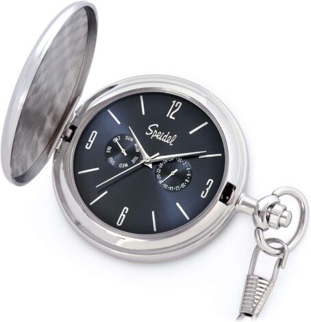 Speidel Classic Brushed Satin Silver-Tone Pocket Watch With 14 Chain, Navy Blue Dial, Seconds Hand, Day And Date Sub-Dials