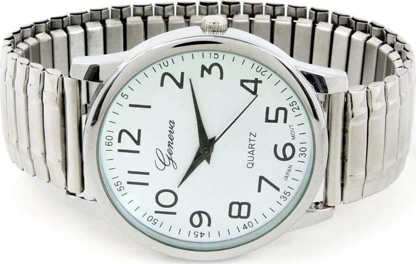 Large Size Silver Round Face with easy to read Black Numerals on White Dial, case size is about 1.5 inches (40 mm), and the Stretch Band is 0.75 inch (20 mm) wide, which will fit comfortably all wrist from 6.5 to 7.5 inches (17-19 cm). It is made by Geneva. Quartz Japan movement.