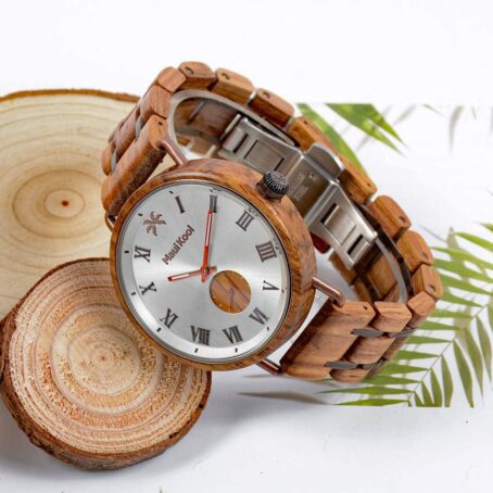 This handmade, analog, splash resistant wooden and steel watch is made with high quality 100% natural wood and stainless steel. Our Kihei watches were designed as unisex watches. The large 39 millimeter face fits great on a man’s wrist, but women who love large faced watches will love them too. Each piece is special since no two pieces of wood are exactly the same. Our watches are lightweight and since they are partly made of wood, little color differences are unavoidable. Each unique piece is elegantly presented in a bamboo box, making this watch a perfect present for him or her. Each watch is paired with a high quality Miyota 0T45 Citizen Japanese Quartz movement crafting the perfect combination of beauty and function and they are guaranteed to be a talking point wherever you go!